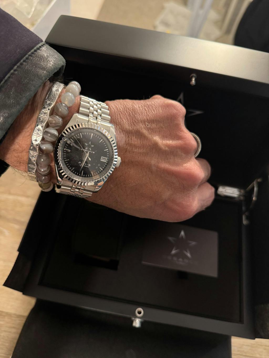 Le boîtier de 40 mm en acier inoxydable 316L allie robustesse et élégance avec ses finitions polies et brossées. Surmonté d’un verre saphir résistant aux rayures, il met en valeur un cadran noir pailleté qui capte subtilement la lumière.